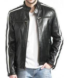 Mens Biker Black Leather Jacket With White Stripes